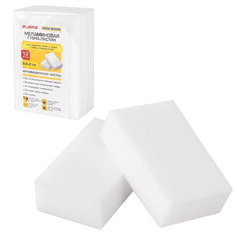 Губка-ластик МЕЛАМИНОВАЯ для удаления пятен, для чистки кухни, уборки, обуви, 9х6х2 см, КОМПЛЕКТ 12 шт., полибэг, LAIMA, 608954 (608954)