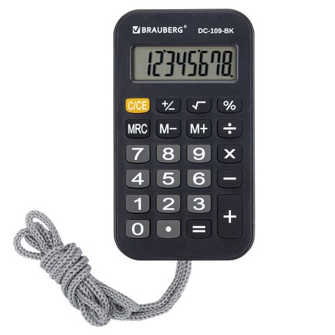 Калькулятор карманный со шнурком BRAUBERG DC-109-BK (61x110 мм), 8 разрядов, ЧЕРНЫЙ, 272642