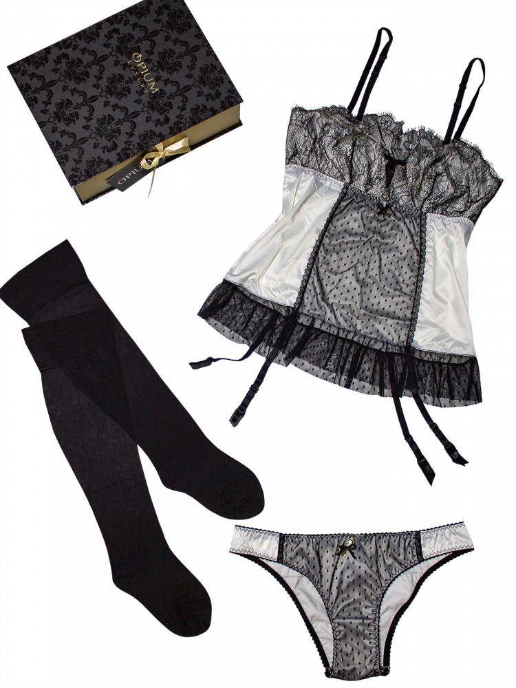 Цвет: Великолепный подарок в шикарной упаковке понравится любой девушке. В коробке, напоминающей драгоценную шкатулку, бережно упакован комплект нижнего белья: шелковое неглиже с подвязками, трусики и чулки. Богатая отделка контрастным кружевом, милые детали-бантики и подвеска-камея на лифе и трусиках. Это действительно наряд королевы. Порадуйте себя любимую или близкого человека роскошным презентом. Состав: камисоль, трусики 90% полиамид, 10% эластан; чулки 97% полиамид, 3% эластан