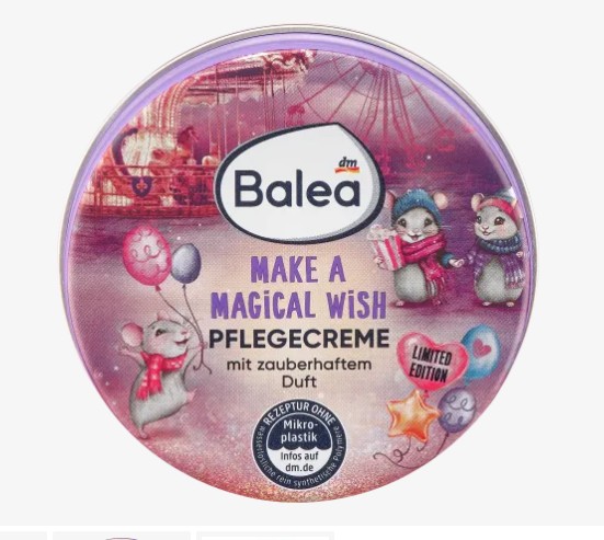 Крем-уход «Загадай волшебное желание» от Balea балует волшебным ароматом. Богатая формула идеально подходит для ухода за телом, лицом и губами. Формула без микропластика и водорастворимых, чисто синтетических полимеров. Совместимость с кожей подтверждена дерматологически.
